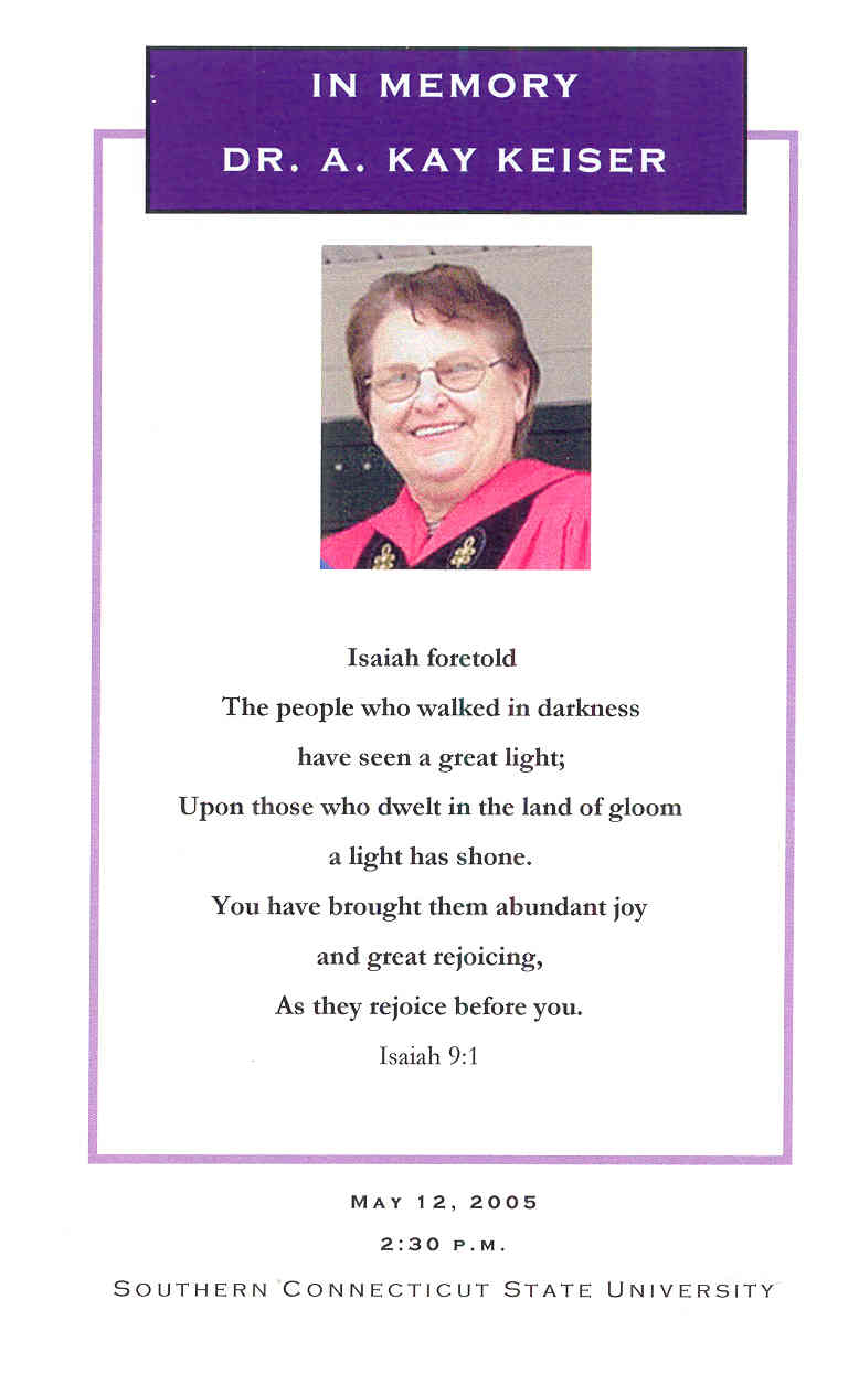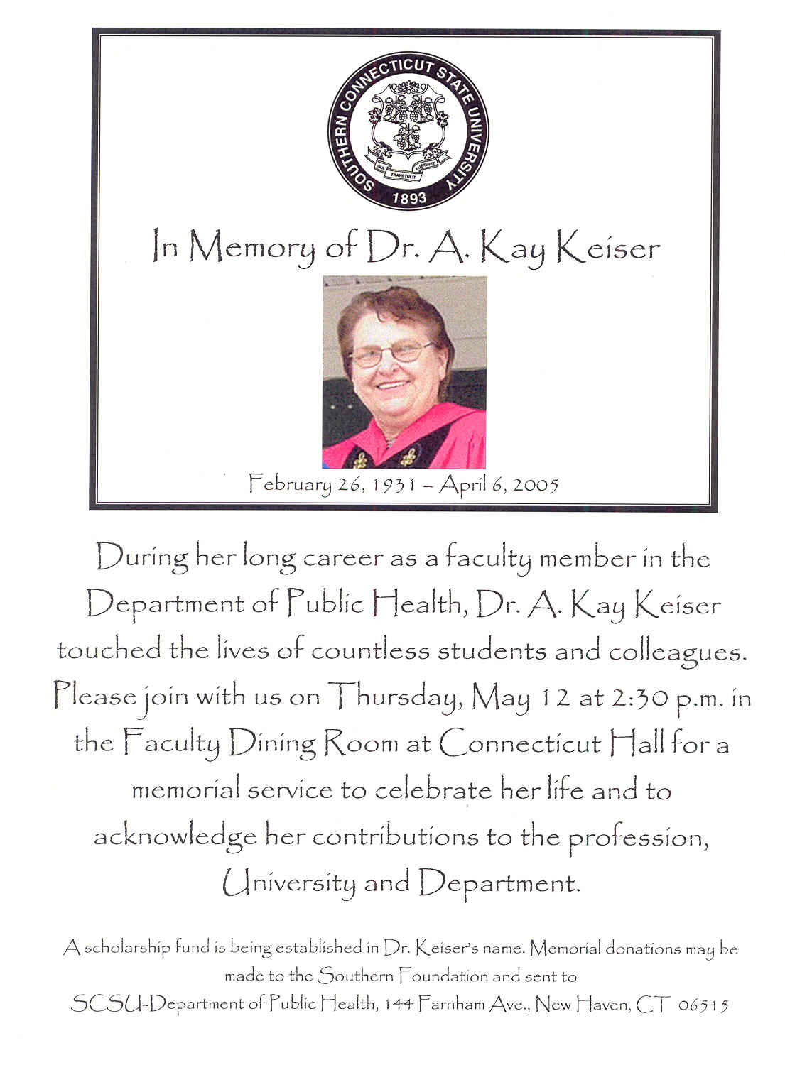 5/2/05 News: During her long career as a faculty member in the Department of Public Health, Dr. A. Kay Keiser touched the lives of countless students and colleagues. Please join with us on Thursday, May 12 at 2:30 p.m. in the Faculty Dining Room at Connecticut Hall for a memorial service to celebrate her life and to acknowledge her contributions to the profession, University and Department.