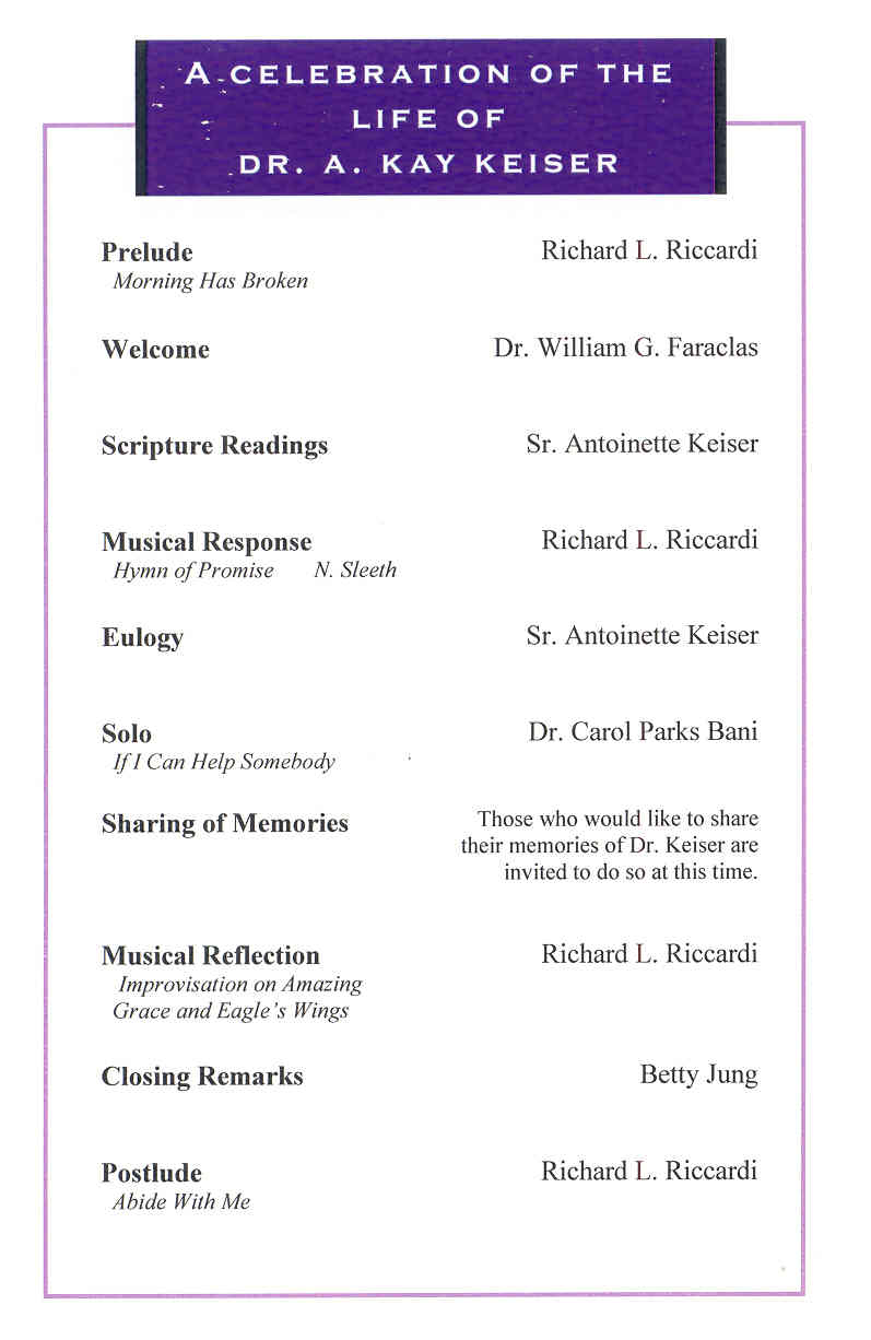 Time: 2:30pm - NA | Subject: Memorial Service for Dr. A. Kay Keiser