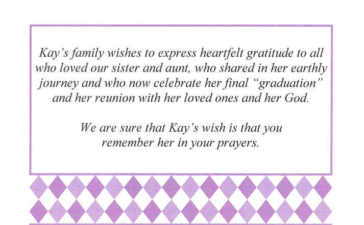 An anonymous thought shared: "I did not know Kay personally. But I came to know her through her students. From their descriptions I could tell she was a woman of quality and integrity!"