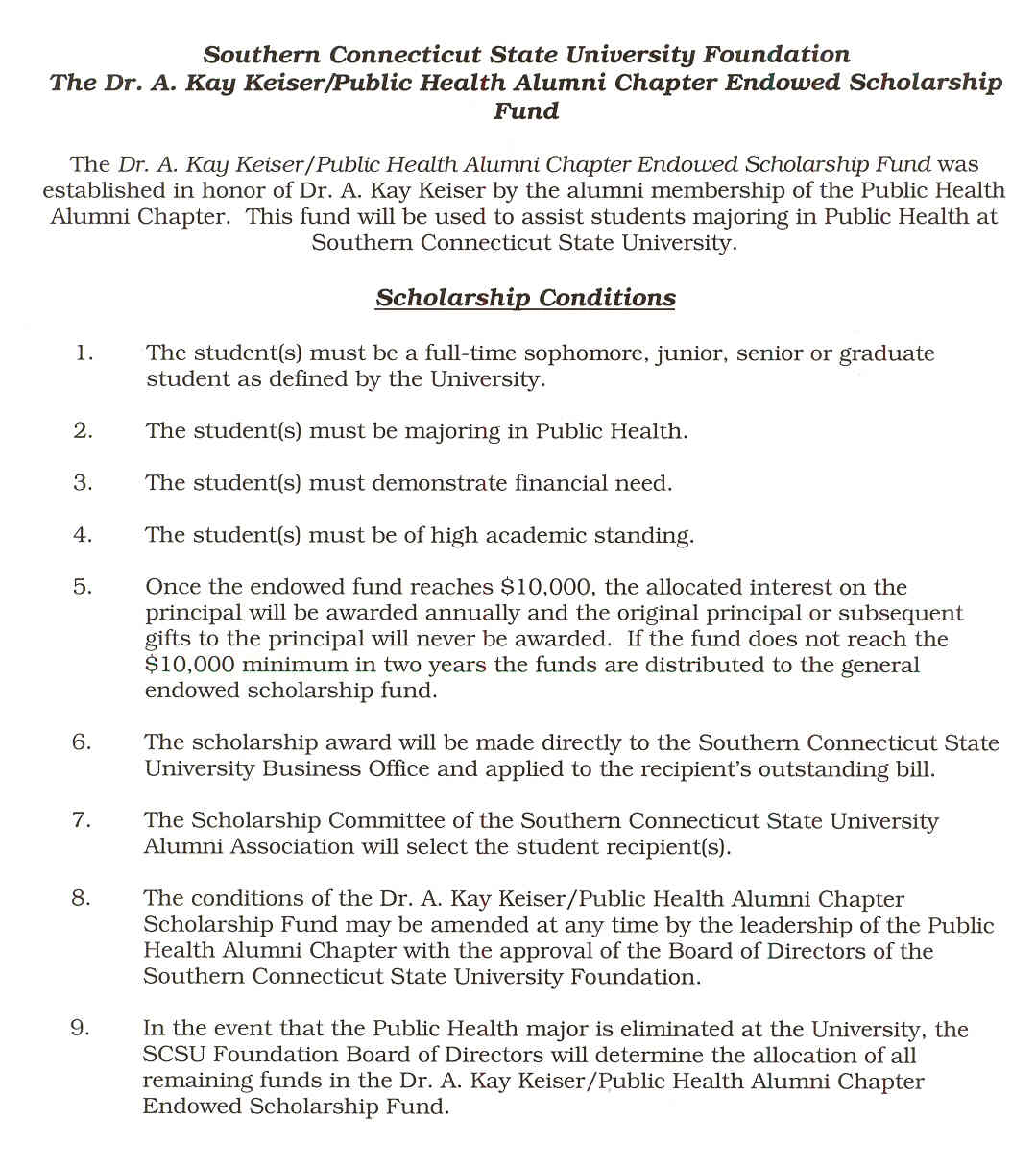 5/18/2005 - Over the summer I will set up a meeting with the SCSU Foundation to do the paperwork for setting up an endowed scholarship in Dr. Keiser's memory. Meanwhile, you can send your tax-deductible donations for the scholarship to the SCSU Department of Public Health. It will be nice to have substantial base when I go for the meeting as we will need to raise $10K in two years, or the monies will go to a general scholarship fund. Remember what a great professor she was, and how much you have learned from her. Let's keep the scholarship in her name!!!